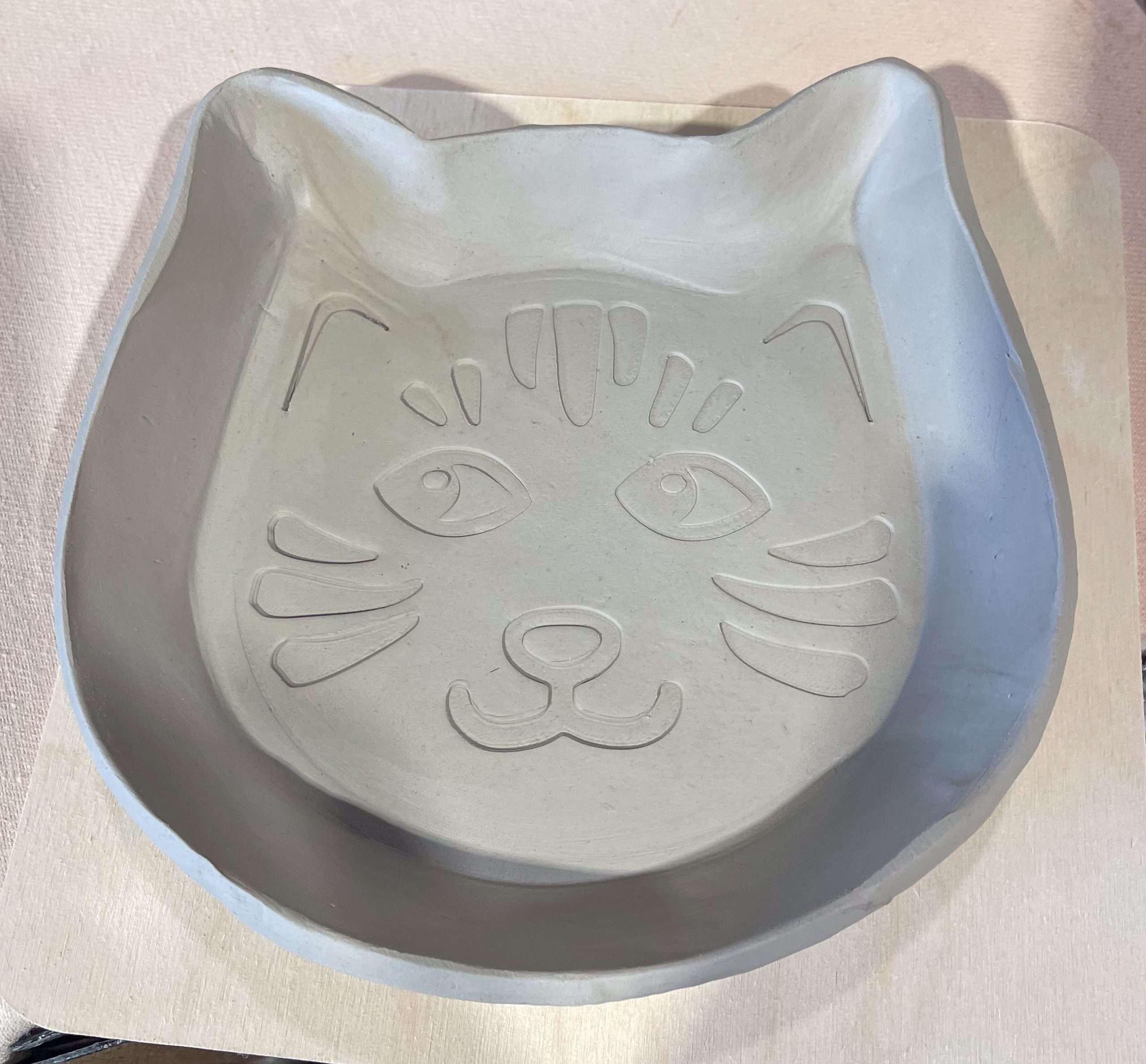 Striped Cat stencil cat food dish (greenware build stage)